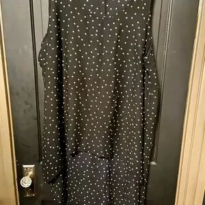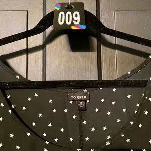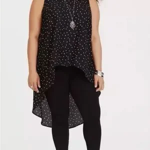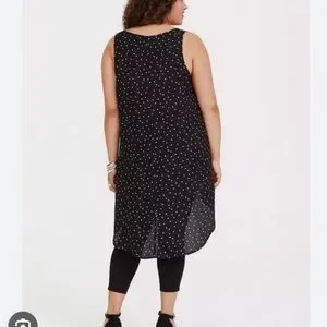 Stylish black top with white star pattern. Sleeveless design for versatile wear.