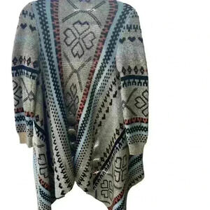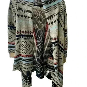 Navy blue, crème, orange, & baby blue TCEC Aztec style print drape like cardigan. Size small. Perfect for fall & winter. In excellent condition.