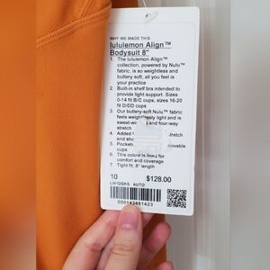 NWT Lululemon Align bodysuit in Autumn Orange, 8", size 10. Has an odd spot in the material on the right front chest area (see pics). It's not a snag, rip, or run in the material. Looks like a factory flaw. Waist is approximately 14".