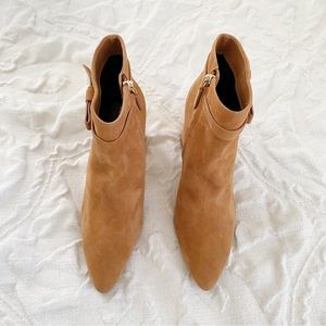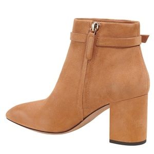 A signature logo charm enriches the ankle strap of a supple suede bootie balanced by a pointy toe and wrapped block heel.