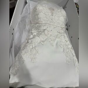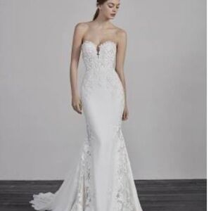 Pronovias Epico Wedding Dress in crepe material. Sz 0. Mermaid style with lace. Sweetheart neckline and open back. Comes with the (cleaned) veil in box. This dress and veil have recently (2025) been professionally cleaned and boxed. Some of the pictures show wine stains and hem soiling that have since been removed professionally. It has been altered but, there is enough seam space left over. The dress is not pure stark white. It is the next level up (Ivory) as suggested by the bridal boutique. It still looks white without the stark bluish white look. NOTE: When preserving wedding dresses, the cleaner does remove the breast pads. Smoke free home. The color seen in the up close image of the bodice, is a reflection from a wreath hanging on the door behind. See images for details.