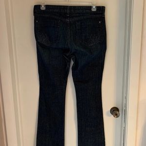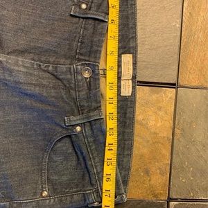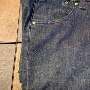 Blue jeans with nice detail on back pockets, hidden watch pocket. Has repair on leg by pocket as noted in pictures, has some slight wear on hem of legs.