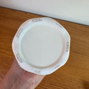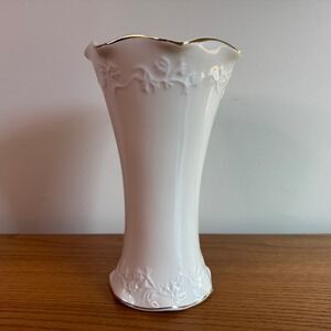 Charming vase featuring a classic design. Standing at approximately 10 inches tall, this piece showcases a smooth white finish complemented by a delicate gold trim along the scalloped opening. The vase is further enhanced by an embossed floral pattern around the base and upper portion, adding a touch of refined elegance to its overall aesthetic.