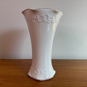 Keywords: white vase, gold trim, embossed vase, floral design, decorative vase, home decor, table centerpiece, wedding decor, elegant vase, ceramic vase, flower vase, vintage style, classic decor, 10 inch vase