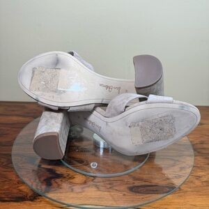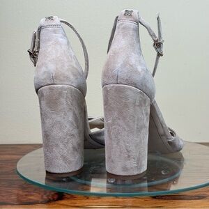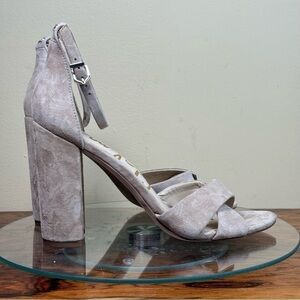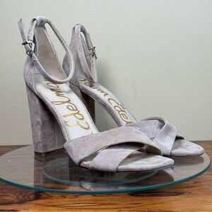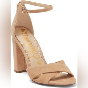 Sam Edelman Yancy Padded Insole Ankle Strap Suede Heel Sandals caramel tan cream oatmeal taupe beige color