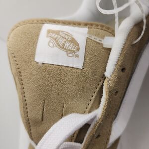 These are very interesting platform Vans in a nice gold suede. They have a puffy tongue, terrycloth lining and some old school styling with the skateboard logo.