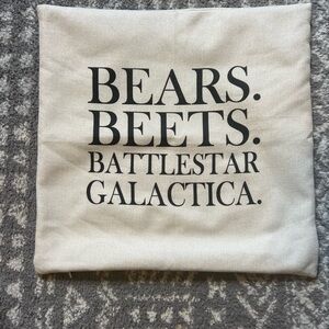 Cream pillow cover featuring bold black text: 'Bears. Beets. Battlestar Galactica.' Ideal for TV show enthusiasts. 18X18 size with zipper closure