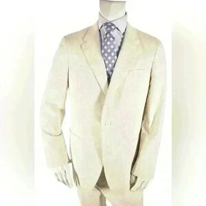 For your summer events, this Italian crafted Paul Smith beige cotton seersucker suit is cool both fashionably and fabric wise. Features a unique horizontal lapel detail, mother of pearl buttons and 1/2 lined interior. Additional 2.5" hem allowance.
