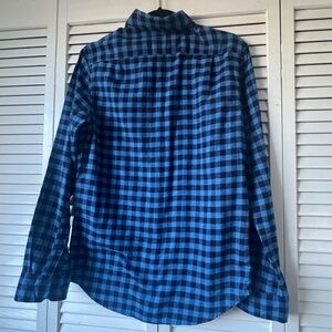 Casual navy plaid shirt with button-down design. Ideal for everyday wear. Comfortable and stylish.