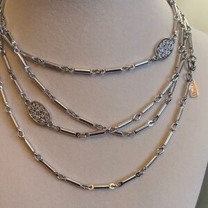 Chic silver tone long necklace. Features intricate oval accents. Ideal for elevating any look. Signed Monet tag. Excellent condition.