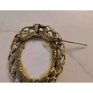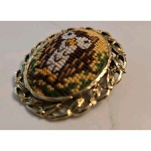 Vintage Embroidered Owl Pendant Brooch Cross Stitch Needlepoint Retro Gold tone