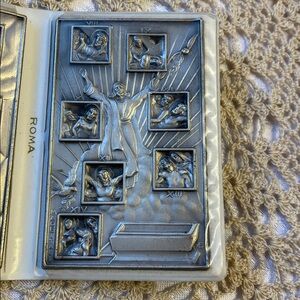 Vintage Pocket Shrine depicting the 14 stations of the cross. Made in Italy. Beautiful silver & gold religious icon book in brown folding case. Features intricate designs & religious symbols. In mint condition. 4x5.5” when open. 4x3” closed. Smoke & pet free home.