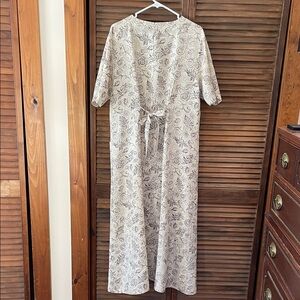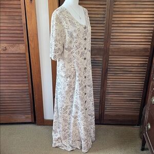 This Chico's Design silk button-front dress is gorgeous and amazing. The silk fabric drapes beautifully, yet feels sturdy, Two front pockets (yay!). Rear waist adjustment ties. The photos do not do justice to this fabulous dress. It would look amazing over a white or brown cami.