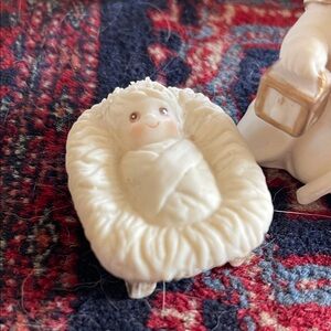 Charming set of white ceramic nativity figurines. Perfect for holiday decor.