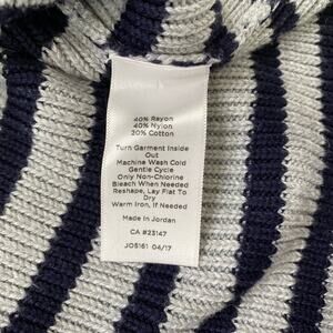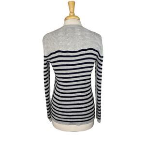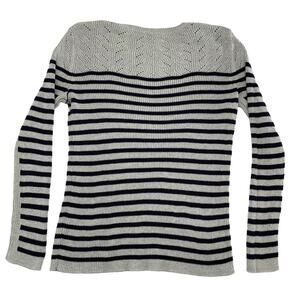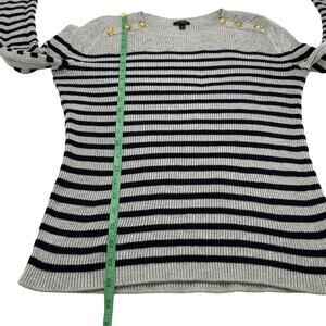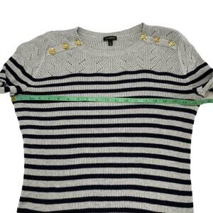 TALBOTS Gray & Navy Blue Stripe with Gold Shoulder Buttons Pullover Sweater. Size Medium Women. Rayon-nylon-cotton blend. Decorative knit around neckline and shoulders. Nods to nautical design with buttons and style. Excellent condition -- no rips, stains, or holes.