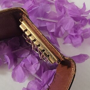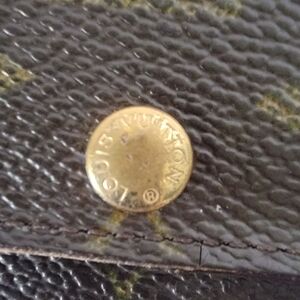 Elegant Louis Vuitton wallet. Classic monogram design. Gold button closure.