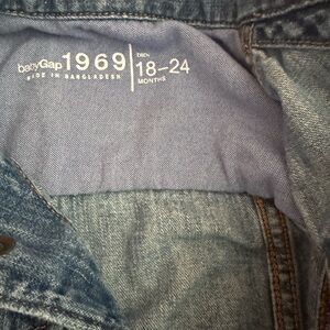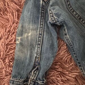 Trendy GAP denim jacket for kids. Features classic button-up style. Perfect for layering. Functional side pockets and top pockets. Super soft and slightly distressed on the sleeve.