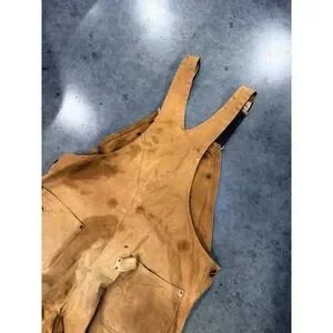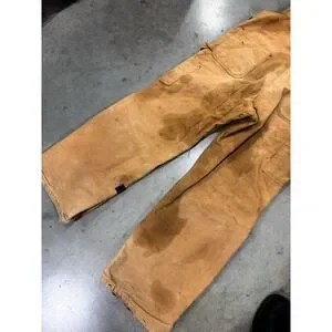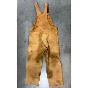 Vintage pair of red guts insulated overalls in classic duck brown a.k.a. tan. Union made. While not thrashed, there are a few small holes and several stains as shown in photos. I am not sure if the person who owned these sat on a bunch of pizzas or what, but these definitely have seen some use. Honestly, they still are quite warm and have a lot of life left. But they are not new and perfect. Worn in and you won't look like every other guy who bought their bibs at tractor supply.