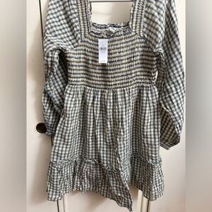 AE Plaid Ruched Long-Sleeve Mini Dress American Eagle Summer Dress Blue