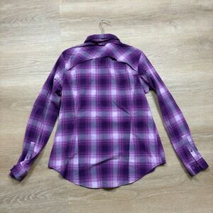 Duluth Trading Co plaid long sleeve button up shirt for women. This shirt features a vibrant purple and grey plaid pattern with a comfortable fit. Designed with practicality in mind, it includes a secure zippered pocket on the chest for storing essentials. The breathable fabric and classic button-up style make it perfect for outdoor adventures or casual everyday wear.