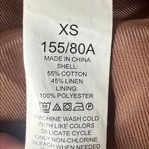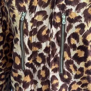 This leopard print coat features a hidden zip-front closure, a mock turtleneck collar when fully zipped, zipper chest pockets, and two front slip pockets. Coat is fully lined and made with a cotton-linen blend that feels like canvas.