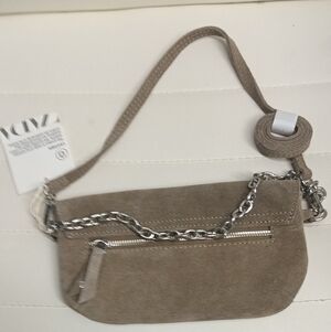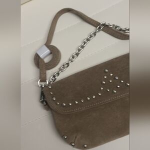 Stylish tan suede clutch with silver stud accents. Features a chic chain strap. Ideal for versatile wear.