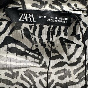 Make a statement in this ZARA zebra-print shirt dress – the perfect mix of chic and playful. Featuring a collared neckline, button-front closure, long sleeves, and a matching waist tie, this dress flatters every figure while keeping things effortless.