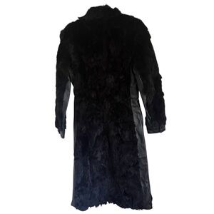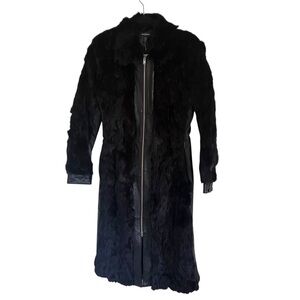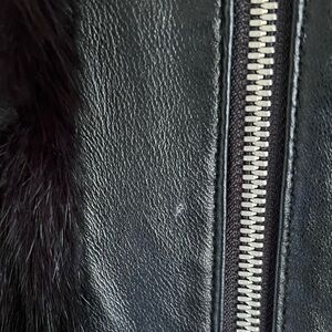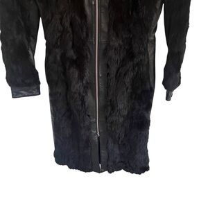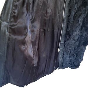New with tags! Black, mixed media rabbit fur and leather jacket. Has zip front closure. Has a couple of white spots and brand tag is upside down but otherwise in good shape.