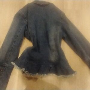 Diane Gilman designer jean jacket size large . Interesting flare ruffle waist , very cool rose button interesting sleeve hem. length 24 in , shoulders 19 in, bust 22 in sleeve 22.5 in