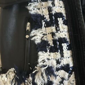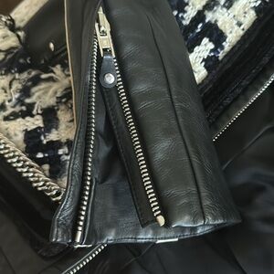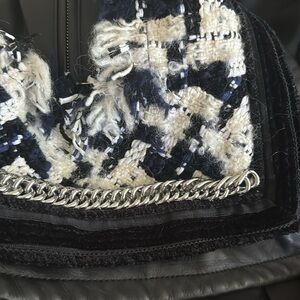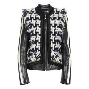 Runway piece, never worn. Statement and featuring so many details! The tweed withfrayed edges and velvet details add ladylike elegance and charm to this sleek biker leather jacket with moto stripes and silver chains. The retail price was $2295. It is a catch that can elevate even the most basic fall look. A star of your wardrobe that is still so versatile!