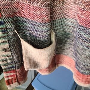 Gorgeous open-front cardigan sweater with a bold Southwestern / Aztec-inspired pattern in coral, teal, navy, brown, and cream. The slouchy fit and soft knit make it perfect for cozy layering over tees, bodysuits, or dresses all fall and winter. Great statement piece for boho, festival, or Western-inspired outfits.