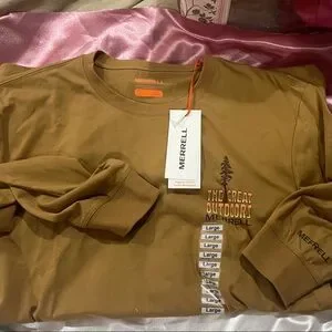 Tan long sleeve shirt by Merrell. Features outdoor-themed graphic.