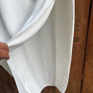 Self-Portrait white crepe midi dress with short sleeves, a wrap-style skirt, and pleating into the side.