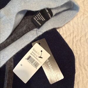 Chic colorblock cardigan with open front. Features navy, light blue, and dark gray tones. 100% cashmere