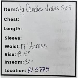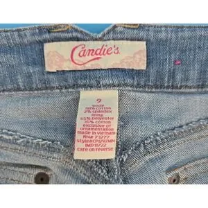 The product is a pair of vintage Y2K Candie's Jeans in juniors size 9, featuring a low-rise bootcut style with a flare bell light. Made from denim fabric with a light wash, these jeans have a zip and button closure and a 5-pocket design. The jeans are designed for comfort and style, with features like slimming, stretch, and breathability, suitable for all seasons. The brand is Old Navy, and the jeans showcase a hippie, grunge vibe that is perfect for those looking for a retro, streetwear aesthetic.