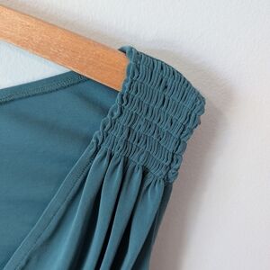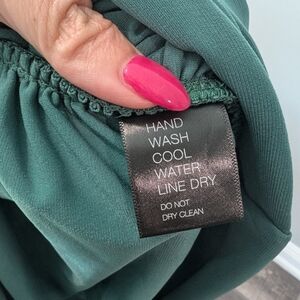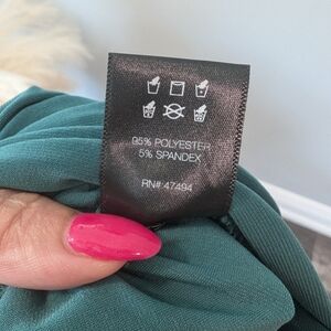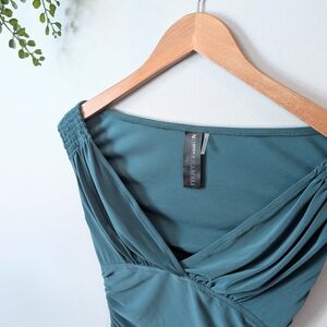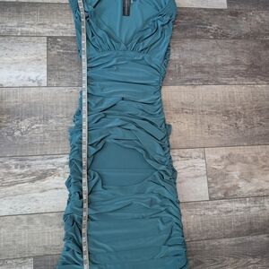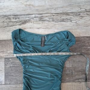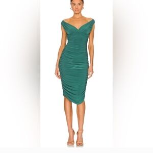 This stunning mountain green dress by Norma Kamali x revolve features a ruched design that accentuates its bodycon silhouette. The off-the-shoulder neckline and cap sleeves add a touch of elegance, making it perfect for cocktail events or a night out. Its midi length and sweetheart neckline create a sophisticated and flattering look. color of dress can look different depending on screen calibration and lighting. color is closer to a teal green than it is to an emerald green. measurements in photos. excellent pre-loved condition