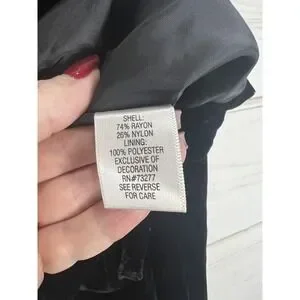 Shell material: Velvet; 74% rayon, 26% nylon. Lining: 100% polyester.