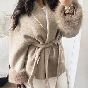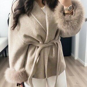 Elevate wardrobes with this khaki casual elegant long‑sleeve coat, with a fully lined interior and contrast faux‑fur trim. An oversized, wrap silhouette features a shawl collar, drop‑shoulder sleeves and belted front which defines the waist. Regular length and hem provide classic proportions, and subtle pocket detailing adds practicality without bulk.