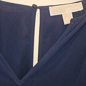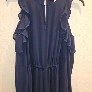 Dressy, Event, Sheer gawzy navy blue cold shoulder by Michael Kors in medium. Romantic ruffle around cold shoulder and elastic waist. this jumpsuit could go to a party or a date night, it's very romantic.