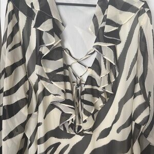 Stylish zebra print midi dress. Features ruffled neckline. Long sleeves. Perfect for any occasion.