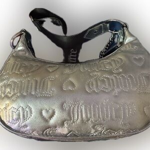 Juicy Couture metallic silver half-moon crossbody bag featuring embossed logo pattern, adjustable logo strap, and zip-top closure. Interior is fully lined with Juicy Couture logo fabric. Tags remain attached.