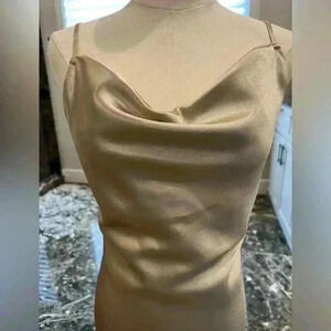 Birdy Grey Champagne Metallic Drape Neck Shiny Satin Dress-Size Small
