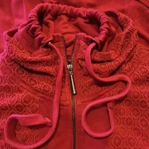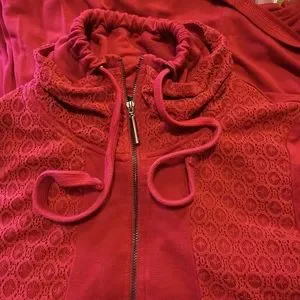 Kensie Red Jersey Knit dress with side draping, deep pockets, quarter zip front with collar. Size medium dress has lace at bodice and under collar. Double collar can be shirred at neck, has ties. Wide A-line skirt, skater style. Measures 17.5" flat underarms and waist, flared at hips. Above knee-length 38" long from back neck to hem. 94% viscose (rayon) and 6% spandex. Machine wash cold and dry low. In excellent condition.