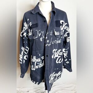 Unisex Martha’s World Black & White Graphic Jacket | Medium. Local Portland Designer. Measurements are approximate: 27 inches in length, sleeve length is 27 inches and pit to pit is 18 inches.