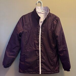 Reversable Stylish purple puffer jacket with a light pink zipper. Perfect for chilly days.