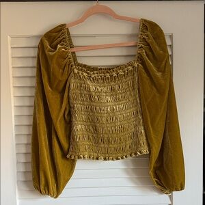 This elegant olive green smocked velvet top is perfect for any occasion. The luxurious fabric and stylish design make it a must-have in your wardrobe.