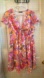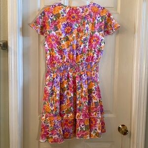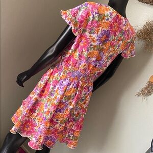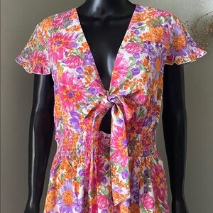 Embrace vibrant style with this floral V-neck dress. Featuring a colorful mix of pink, orange, and purple, it's perfect for any occasion. The tie-front detail adds a charming touch.
