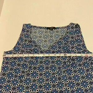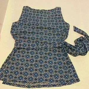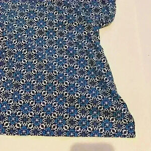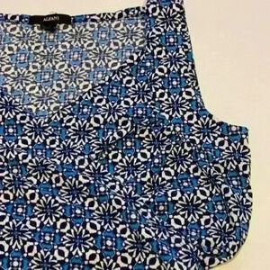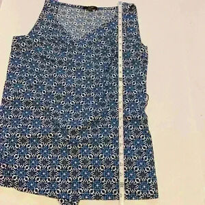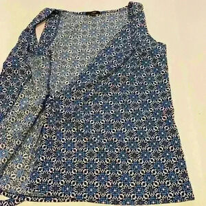 Gently worn Alfani wrap top. Pattern of blues and white. Easy to wear material. Gently worn and has a lot of life. No rips or stains. Polyester and spandex blend. Hand wash cold. Super cute and perfect to pair with white capris for the summer.