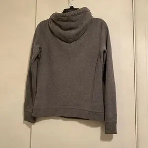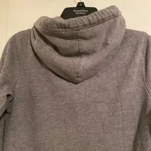 Cozy heather gray hoodie with front pockets. Features a drawstring hood and zip closure and front pockets.