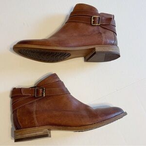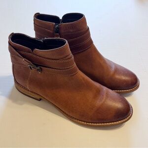 Clarks Maypearl Edie ankle boots. Brown leather upper. Burnished toe, distressed style. Strappy detail with side zipper. Good used condition, interior has a bit of wear/flaking at edge shown in photos, exterior excellent condition. See all photos for condition and any signs of wear. Women’s size 10M, 1” heel. I do not have the original box.